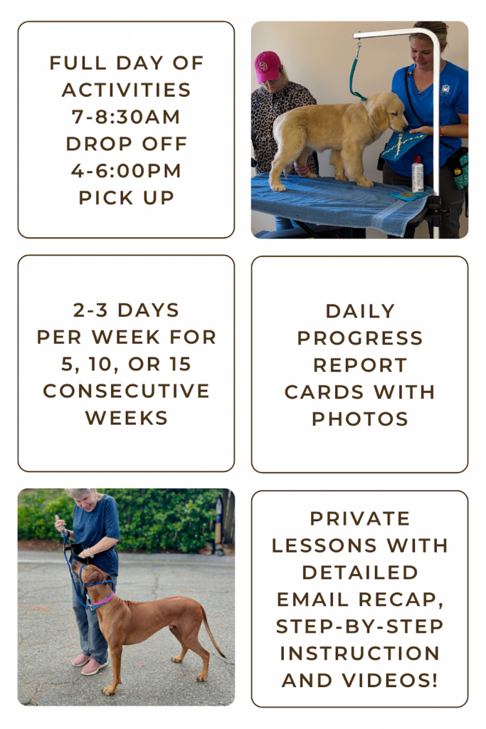 • Multiple dog training sessions per day practicing skills to achieve goals we set together